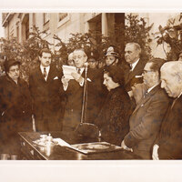 Fotografia da colocação da Placa de Homenagem da Casa onde nasceu Maria Matos, presença de Maria Helena Matos - Lisboa ( Penha de França)